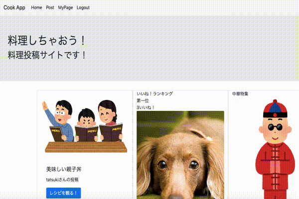 今回就活に向けて、railsを使ったレシピ投稿アプリを製作しました。 今まではsinatraを使ったアプリケーションしか製作したことがなく、レベルアップもかねてrails tutorialを参考にしながらレシピ投稿アプリに挑戦しました。 まず、なぜこのアプリを作ろうかと思ったのが、今まで簡単な掲示板のようなアプリしか作ったことが無かったのでさらに複雑な機能も加えたいと考えたのと、純粋に料理が好きだからです。 次に機能としては、ログイン、ログアウト、サインアップ、ユーザー情報の編集、記事の投稿、画像のアップロード、記事の編集、削除、いいね機能、ランキング機能、料理の種類(例えば、和食など)ごとの特集機能、などを実装しました!こだわったのは、bootstrapを使ってレスポンシブデザインにしているところです。 git hubにもリポジトリがあるのでぜひ見てみてください! git hub 20yuteo