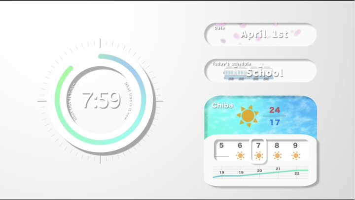 ◯「1日の始まり」 この作品は、題名の通り1日の始まりというのをテーマに作りました。 ※作成にはAdobe After Effects 2022を使用しています。 ◯夜から朝へと転換するシーン 背景の色で朝と夜を表現し、夜の時は左上からの光、朝になって影の向きを変えることで月が落ち太陽が登ったことを表現しています。 太陽マークと月マークの点灯・消灯でも表しています。 ◯様々な情報が出ているシーン 左は時計を、右は上から日付、その日の予定、天気・温度を表しています。 起きてみんなが確認する項目を表示させました。 日付のところは4月1日ということで、春を感じさせるため背景にパーティクルワールドを使った桜を降らせています。 予定のところは学校を関連させるものを背景に入れたく電車を走らせました。 天気のところはiPhoneの天気アプリをもとに作りました。上の部分は空の色をイメージしたグラデーションにしており、フラクタルノイズで雲を演出しました。 背景にもCC Vignetteを使用して各レイヤーと同じ光の当たり方をさせています。 それぞれのシーンをモーションブラーで躍動感をつけ、イージーイーズで緩急をつけています。