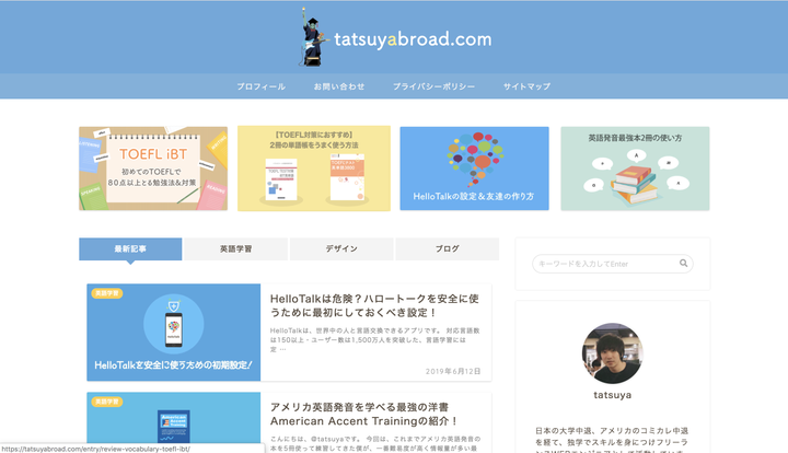 英語学習・海外・デザインを中心に発信している個人サイトです。 英語発音やTOEFLの教材の記事でGoogle検索上位表示を達成しています。 運営期間:1年8ヶ月 月間PV:10,000 ~ 15,000PV ※現在は休止