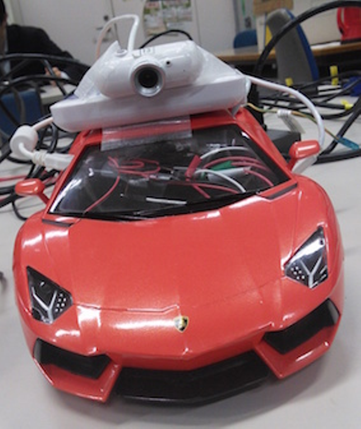 市販のラジコンを改造して、カメラを使ってストップラインを認識して止まったり、車線を認識してそれに沿って走るものを作った