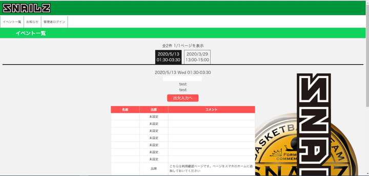 自分が所属するバスケットボールサークルにゲストメンバーとして参加する人用にイベント管理・メンバー出欠管理用として作成しました。 サクラレンタルサーバー上にCAKEPHP2・bootstrap3を使用して構築しています。 ※詳細コメントは適宜編集中