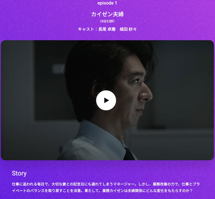 企業のカイゼンコンサルタントをテーマにしたCMドラマを監督。 「カイゼンコンサルタント」がもたらす変化を、夫婦の物語を通して描きました。 単なる業務改善にとどまらず、その先にある未来を見据えたシナリオを構築し、制作。 ドラマ性とCMとしてのメッセージ性を融合させ、心に響く映像を生み出しました。