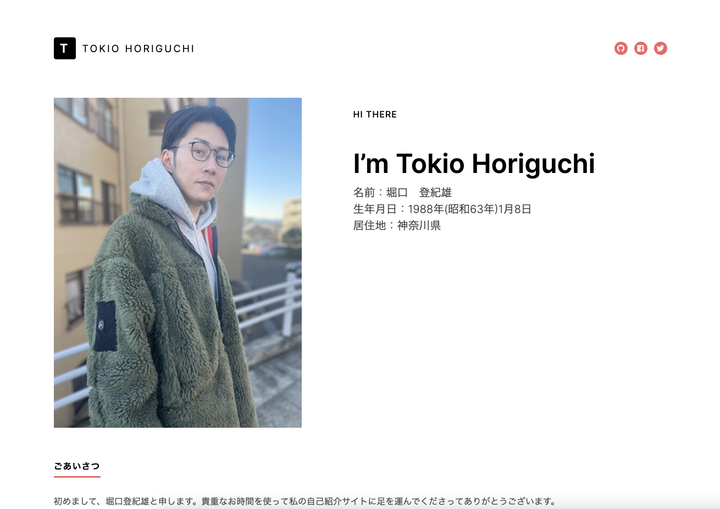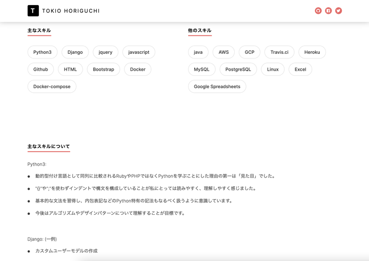 自分のスキルや経歴などをまとめた自己紹介サイトです。 Bootstrapテンプレートを用いて作成。 ホスティング環境はAWS Route53 > Cloudfront > S3です。 ポートフォリオサイト(Pictoforio)へのリンク、説明もあります。