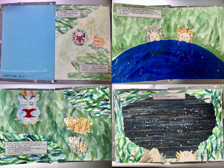 モダンテクニックを用いオリジナルの絵本制作を行いました。「いちばんぼし」というはりねずみ2匹がいちばんぼしを探して旅に出る物語です。