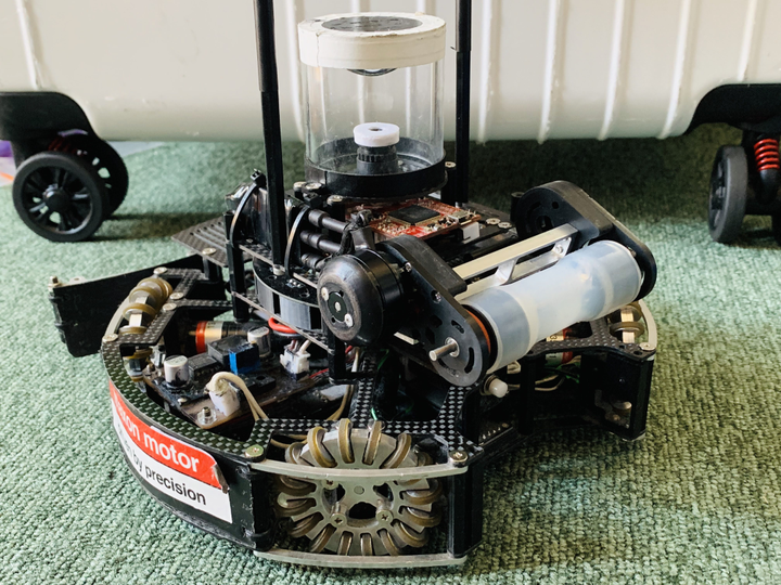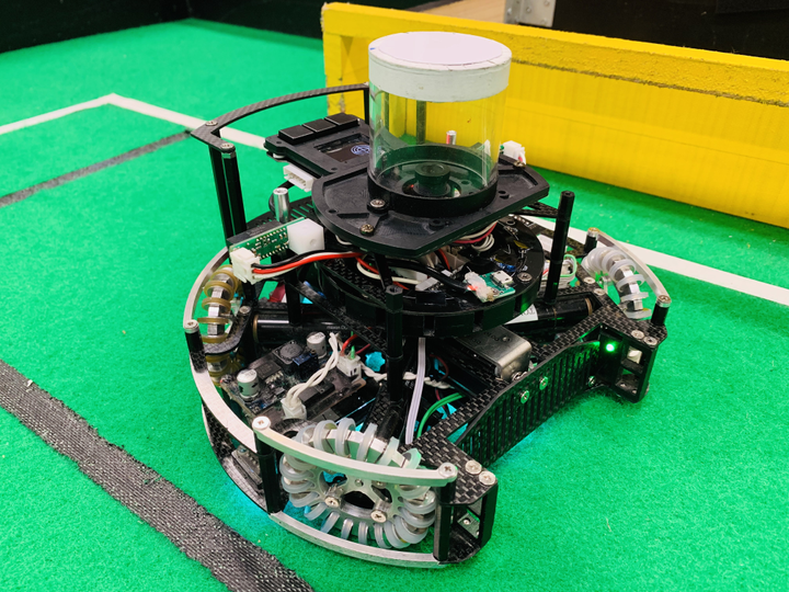 Ri-oneではサッカーロボットの開発を行いました.RoboCup SSL(小型サッカーリーグ)に参加しています.私はチームマネジメント(ドキュメント管理.会議ファシリテーション及び議事録管理.組織体制構築.)を3年間とメカ設計(遊星内歯車減速機,サイクロイド減速機の開発など)と回路設計・電気組み込み制御(ブラシレスモータドライバの設計開発)を行いました.