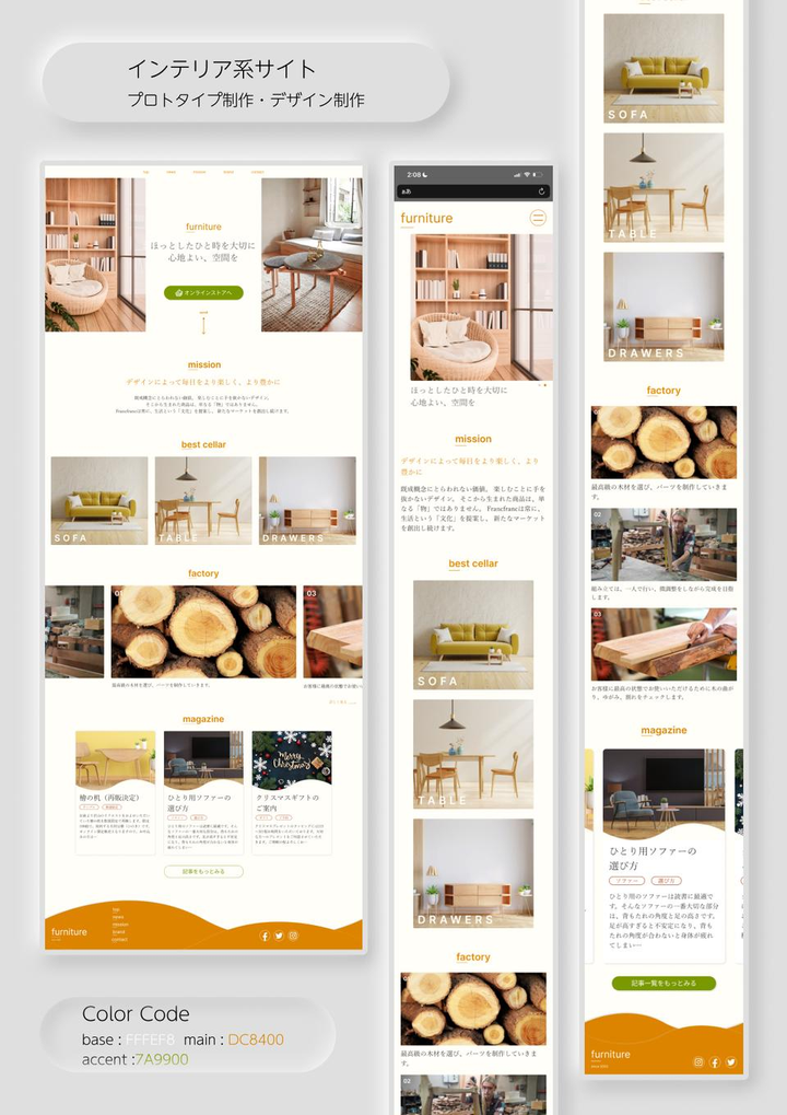 ペルソナ:女性(20~30代) 独身or既婚 年収:0~400万円 メインカラーはオレンジで落ち着いた印象を引き出す為に落ち着いた緑をアクセントカラーに使いました。 字体は、2つ使っています。 余白は広めに設定し、FVは画面サイズが小さいデバイスにも対応させるため小さめに作成。 制作期間:10日(ディレクション、デザイン) コーディング(外注)含め、20日