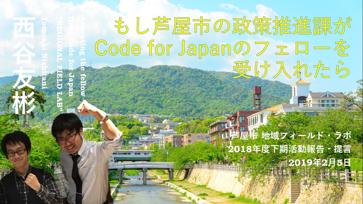 Code for Japanによる自治体への外部人材派遣型研修プログラム「地域フィールドラボ」で、2018年度下期に芦屋市に政策推進課に派遣されたフェローの最終報告です。
