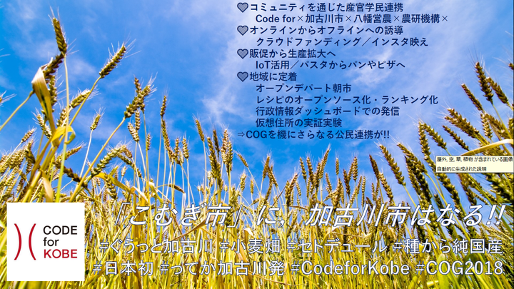 東京大学主催による自治体の課題解決アイデアコンテスト「チャレンジ!!オープンガバナンス2018」のミニプレゼンにおいて、Code for Kobeとして発表した際の資料です。アイデアのポスターに誘導するための1枚ものになっています。
