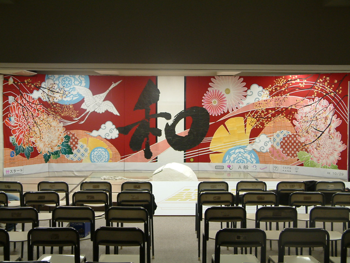 デザイン科が関連校も巻き込んで、企画、プレゼン、デザインをするという取り組みをしました。 「和」をコンセプトに、統一した意匠、大道具から小道具、校内の飾り付けまで、協力して行いました。