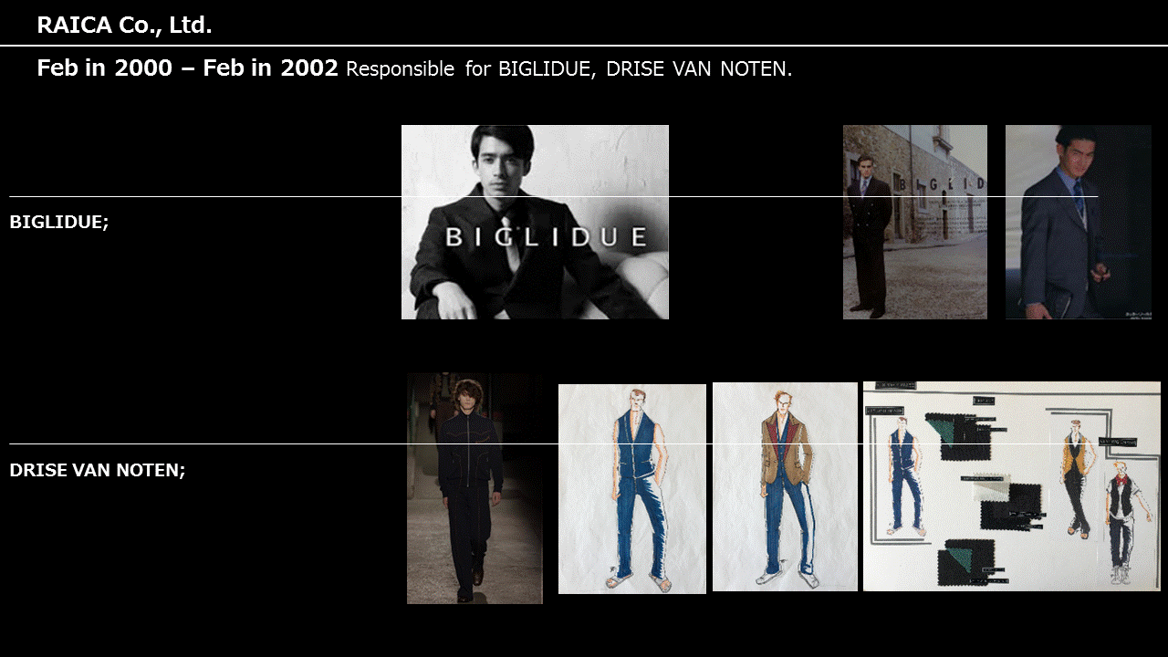 デザイナーズ、オーセンティック、スポーツ、ファストファッションと幅広いチャネルでメンズ、レディース両軸のチーフデザイナー、MD、ディレクターとしてマーケット検証、課題抽出・分析、仮設立案から企画を構築し具現化。開発、企画、生産管理を一貫しキャリアを形成。