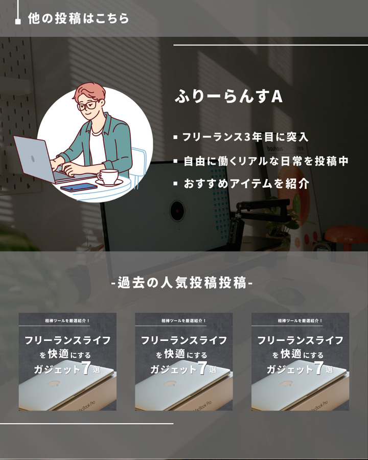 【ターゲット】 20〜30代のフリーランスの男性 【制作のポイント】 ブラックを基調に、余白感を持たせ洗練された スタイリッシュさを演出しました。 アイテムごとに分け、 キャッチコピー・写真・商品名・説明文を 分かりやすく配置し「情報が伝わる」構成にしています。 保存したくなるまとめページと、 最後のページではフォローに繋がる工夫をし クライアントの目標達成の お力になれるデザインに仕上げました。