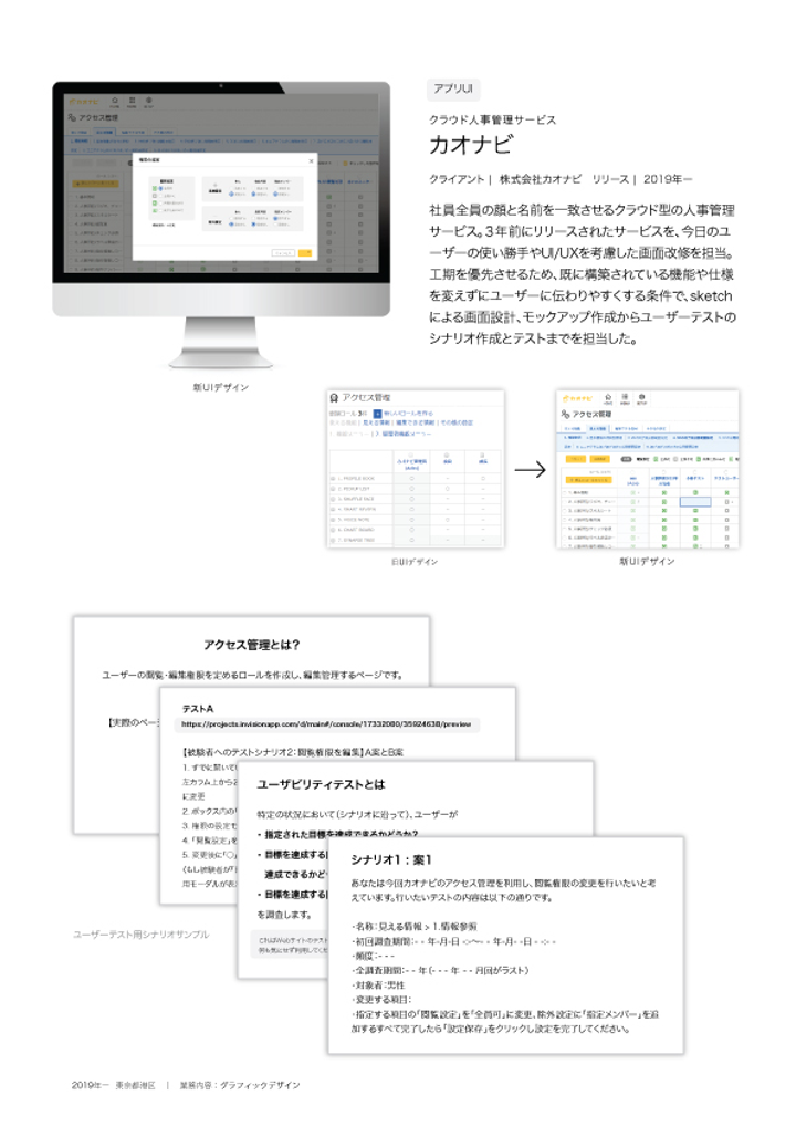 社員全員の顔と名前を一致させるクラウド型の人事管理サービス。3年前にリリースされたサービスを、今日のユーザーの使い勝手やUI/UXを考慮した画面改修を担当。工期を優先させるため、既に構築されている機能や仕様を変えずにユーザーに伝わりやすくする条件で、sketchによる画面設計、モックアップ作成からユーザーテストのシナリオ作成とテストまでを担当した。