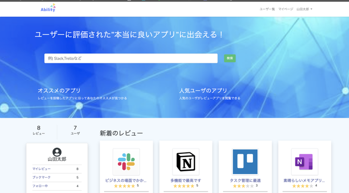 サービス名:Ability URL https://ability-applications.com/home GitHub https://github.com/tomoya-kamaji/ability ✅ サービス概要 アプリに特化した情報共有サービス。 個人間でアプリをレビュー、共有することで自分にあったアプリを見つけることができます。 ✅ なぜ作成したのか? ユーザに多くのアプリを知ってもらって、生活、業務に取り込んでいただくきっかけを作りたいという想いから作成しました。 ✅ 私の原体験 新卒でSierに入社した当初は、自分の業務のやり方がアナログで非効率でした。 頼まれたことを紙のメモや付箋を使って管理しますが、すぐになくしてしまう、字が汚くて読めない。結局役に立たない。 そんなとき、職場の周りの方が様々なアプリを使用して業務の改善を図っていました。(TrelloやOneNote、VSCODEなど) 見たことのないツール、サービスを匠に使いこなされていて感動したことを覚えています。 それを見てすぐにインストールして自分の業務に取り込んでいき、少しずつ業務を改善していくことができました。 使っていて自分の能力が高まった感覚になり、それからは最新のツールやサービスを見るのが大好きになりました😁 そのときにもっと早くそういったサービスを知るきっかけを作りたいという思いから、個人でカジュアルにアプリを共有できるサービスを作成しました。