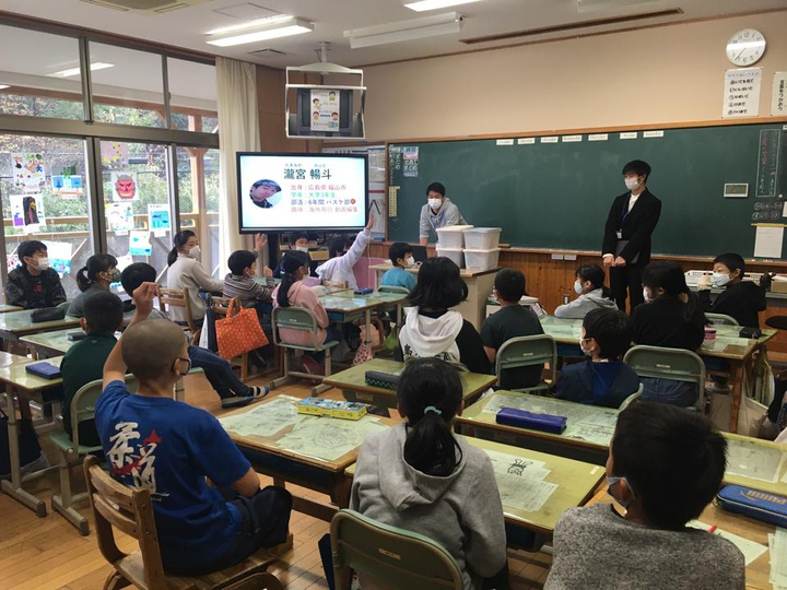 島根県付近の日本海には多くの海洋プラスチックが存在しており、綺麗な景観に被害が及んでいると感じた。そこで、その海洋プラスチックを用いて警鐘を鳴らすようなイベントができないかと考え、市役所の方と連携し、1年がかりで準備を行いイベント開催をした。 写真は、海洋ゴミについて近くの小学校へ出前授業を行なっている様子である。 最終的にイベントには2日間で300人ほど集まり大きな反響をもたらした。