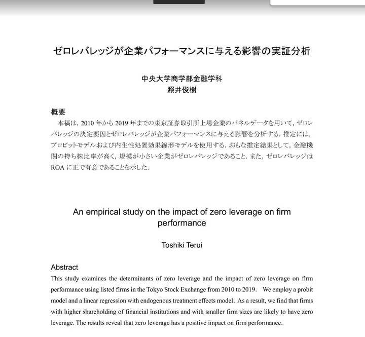 ゼロ レバレッジが企業パフォーマンスに与える 影響を分析しました。 おもな推定 結果として,金融機関の持ち株 比率が高く,規模が小さい企業がゼロレバレッジであることを示しました。 また、ゼロ レバレッジはROAに正で有意である ことを示しました。 推定には,プロビット モデル および内生性処置効果線形モデルを使用 しました。