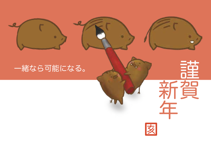 学内のコンペで「協働」をテーマにした年賀状を作成することになり、私は二匹のイノシシが大きな絵筆で協力しているいのししを描いているというイラストを描きました。