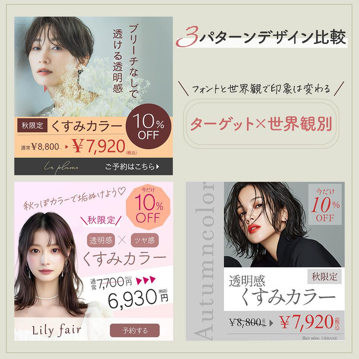 同一サービスを3つの世界観でデザイン。 ターゲットに合わせたフォント・配色・レイアウト設計で、印象の違いを比較できるバナーを制作しました。