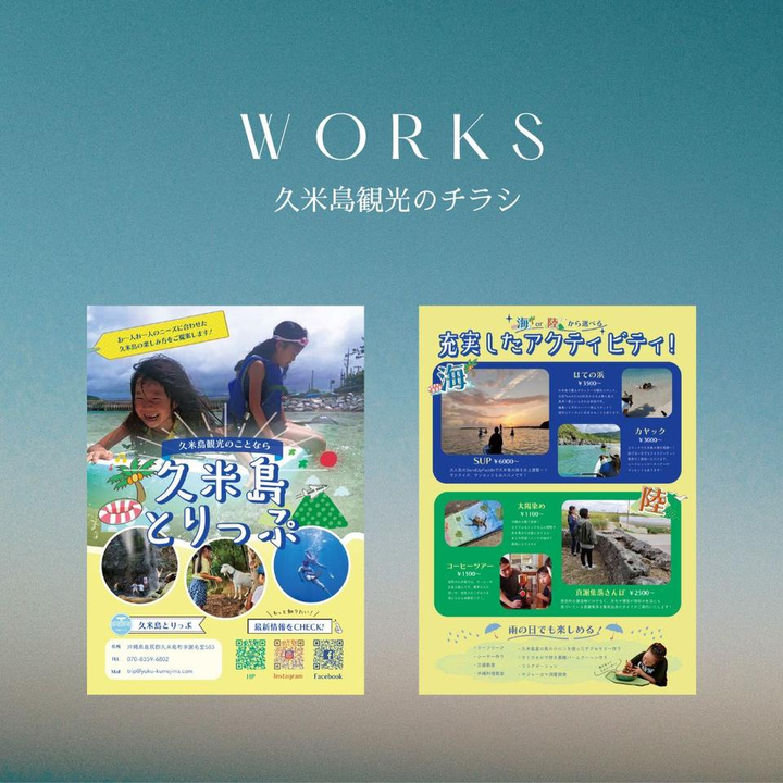 久米島観光会社のチラシを制作しました。 【ご要望】 •元気な感じのカラー •インパクトがある •家族向け 【こだわったところ】 •明るい久米島らしい雰囲気がでるように黄色をメインカラーに仕上げました。 •ワクワクするチラシになるよう、文字周辺の装飾を工夫しました。 •海と山のアクティビティの色をわけて、見やすくしました。