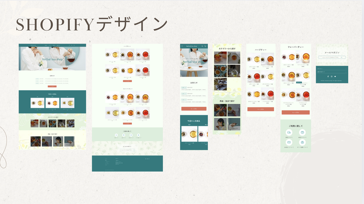 ハーブティーECサイト (使用テーマ:BE YOurs) 「ハーブティーで おしゃれに自分を労る時間」 を想像できるようにしました。 ターゲットである 30代女性に合わせた、 明るくも落ち着いた色味と 丸みのあるゴシック体フォントで ハーブティーの身体への 優しさ、健康に良いということも 表現しました。 背景の色や画像を セクションごとに変えることで みて楽しい、ワクワクする サイトにしました。