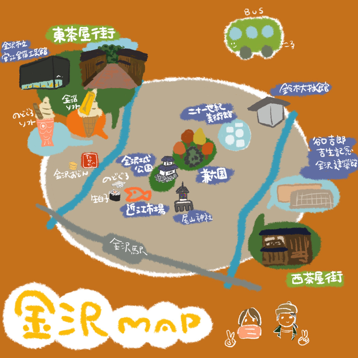 自分の金沢旅行についてのインスタグラムの投稿にあげた金沢の地図です。学芸員課程の実習で仲良くなった後輩と二十一世紀美術館目当て金沢に行きました。