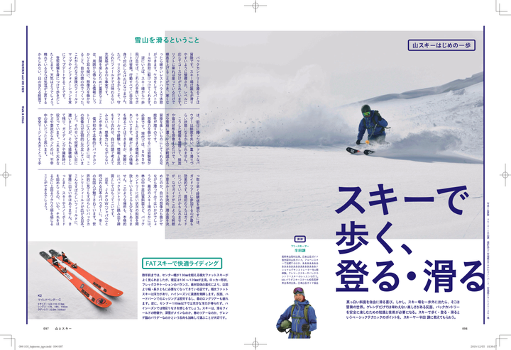 山と渓谷社が発行する山スキーにフォーカスをあてたムック「山とスキー 2020」で担当したテクニックページ。東北は宮城県をベースに、冬は山岳スキーガイド、夏はアドベンチャーガイドとして活躍する半田譲をモデルに、雪山を歩き、登り、滑るためのテクニックを紹介。企画構成、編集とライティングを行う。