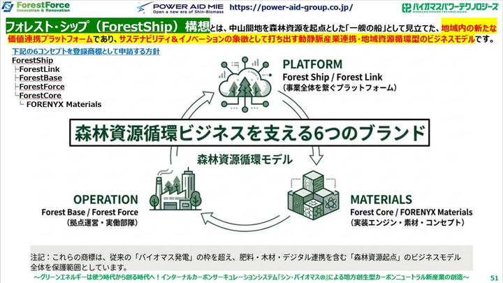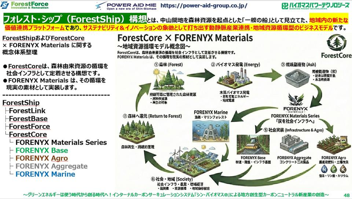 Forest Ship(フォレスト・シップ)構想とは、中山間地を森林資源を起点とした「一艘の船」として見立てた、地域内の新たな価値連携プラットフォームであり、サステナビリティ&イノベーションの象徴として打ち出す動静脈産業連携・地域資源循環型のビジネスモデルです。 https://www.youtube.com/watch?v=EO3V0uwygAU 社内・社外関係者の皆さまの温かいご支援とご鞭撻により、 当社は 11 年目を迎えることができました。2026年は、このForest Ship(フォレスト・シップ)構想の社会実装を本格化させるとともに、 資源循環事業部を中心とした燃焼副産物のアップサイクル事業を本格的に展開してまいります。 これにより、シン・バイオマス®エネルギー事業・森林事業・資源循環事業が三位一体となった、 進化系の垂直統合型ビジネスモデルを、より明確な形で社会に提示していく所存です。