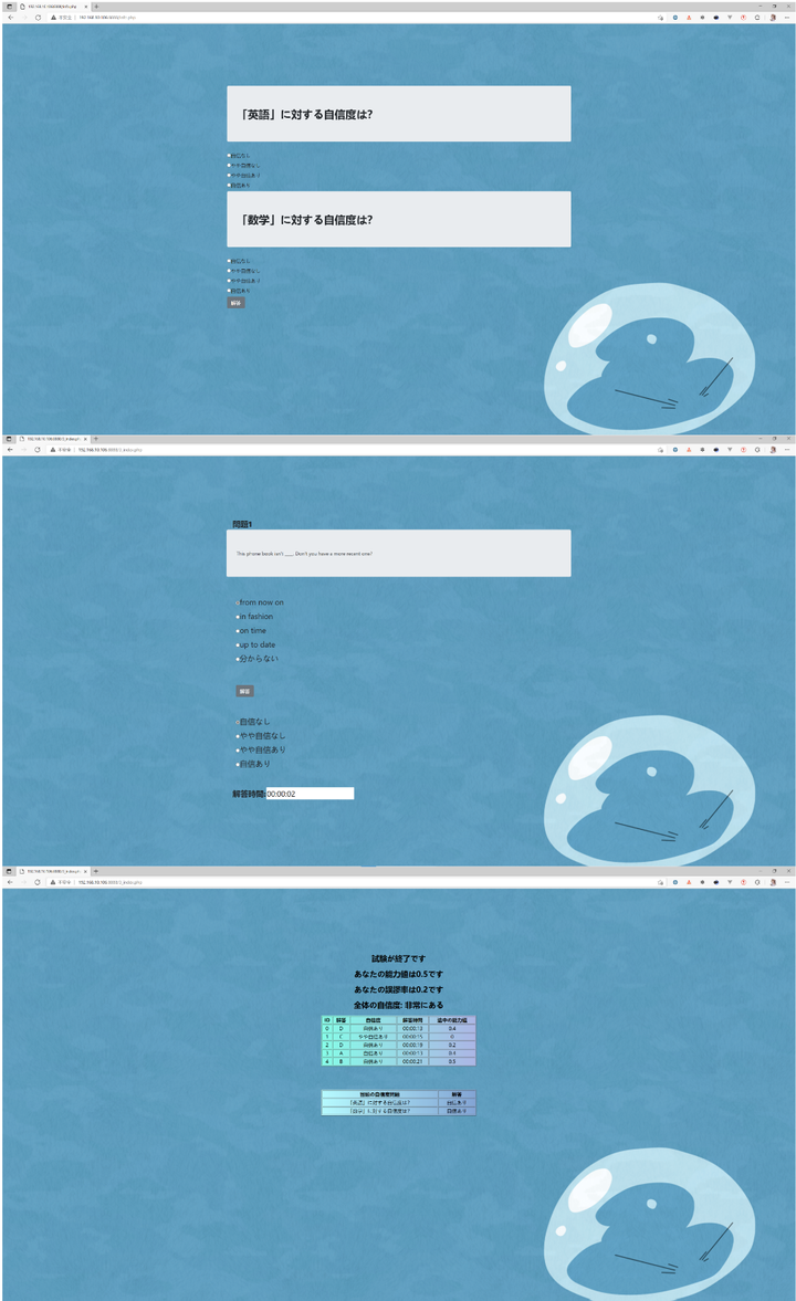 【紹介】:受験者の項目への反応をモデル化した項目反応理論に基づき、パラメータ推定の方法を学び、PHP、JSを用いて項目反応理論(IRT)をテストシステムに実装しました。 受験者の入力に対し、システムはその受験者の能力値を逐次推定し、その能力値付近を測定するのに最も良い項目を出題することで, それぞれの受験者の能力に最適な問題系列を出題します。