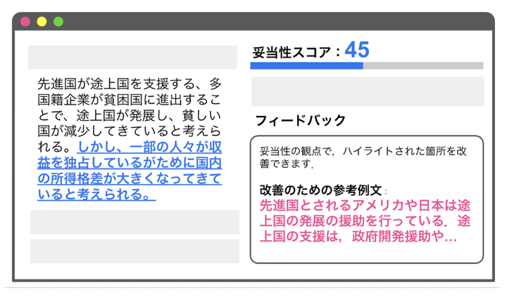 レポートや論文をはじめとし,意見や提案を主張する際には,文章の説得性が重要である.しかし,説得性の高い文章を書くためのフィードバックの機会は充分ではない. 本研究では,書き手による説得性の高い文章執筆を支援するインタフェースの設計方法を提案する.提案するインタフェースは,説得性の高い文章執筆を支援するために,ユーザが書いた文章中で修正すべき箇所を指摘し,その修正すべき箇所を改善するヒントとなる例文を提示する.修正箇所の指摘のため,BERTによる回帰モデルを構築し,Attentionによる文章中の修正箇所の可視化を行う.例文提示のために,GPT-2の学習データとして小論文データを用いて,文章生成モデルを作成する.これらの提案するインタフェースのふるまいによって,書き手の文章の説得性についての執筆態度の変容を狙う. --- Frontend: React.js Backend: Python (fastapi) DeepLearning: PyTorch, transformers -- 画像は論文用のイメージです.実際のシステム画面は別途ありますが,Still Workingです.