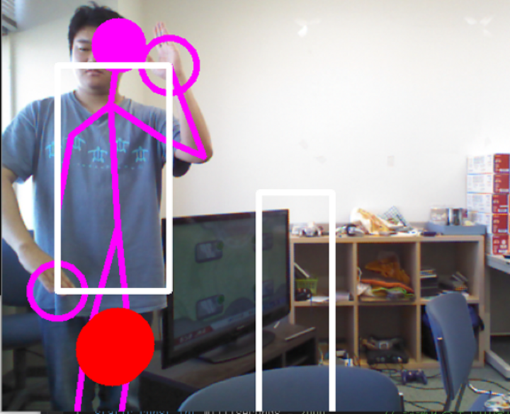 「Kinect」とは? 人の位置や動き、声、顔を認識することができるモーションキャプチャです。 研究室での研究 「Kinect」の基本情報の理解や、これらの技術はどのような場所で応用され使われているのかということを学習しました。 最終成果物としてバレーボールのような、ボールを相手の陣地に落とすゲームを作成しました。 まず、人を検知して関節から関節に線を引くことで、スケルトンボーン(人の骨格のようなもの)を作りました。検知した人間の頭と右手、左手、ボール、ネットに当たり判定があります。