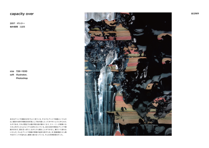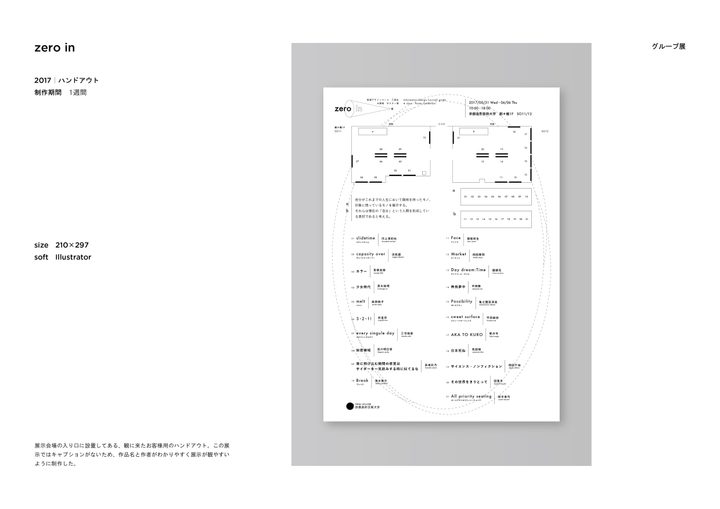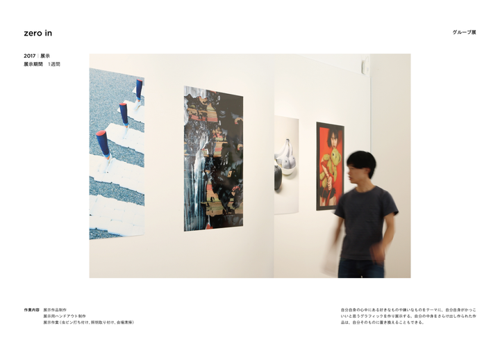 京都造形芸術大学情報デザインコースで行われたグループ展「zero in」で展示された作品。 自分自身の心中にある好きなものや嫌いなものをテーマに、自分自身がかっこ いいと思うグラフィックを作り展示する。