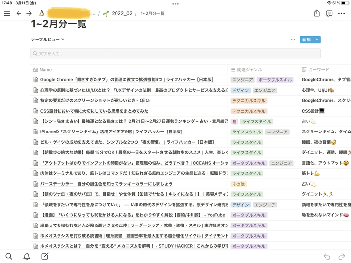 毎日1件以上、ネット記事などの情報共有をしています。 ▼実施している理由 面白いと思ったものを共有したかったり、 その分野に知見・興味のある社員との交流のきっかけにしたり、 テクニカル・ポータブル両スキルの向上の参考になればと思い、続けています。 ▼使用ツール Feedly (ニュースアグリゲータアプリケーション) Notion (情報格納場所) Notion web clipper (情報収集) Slack (情報共有場所・社内ツール)