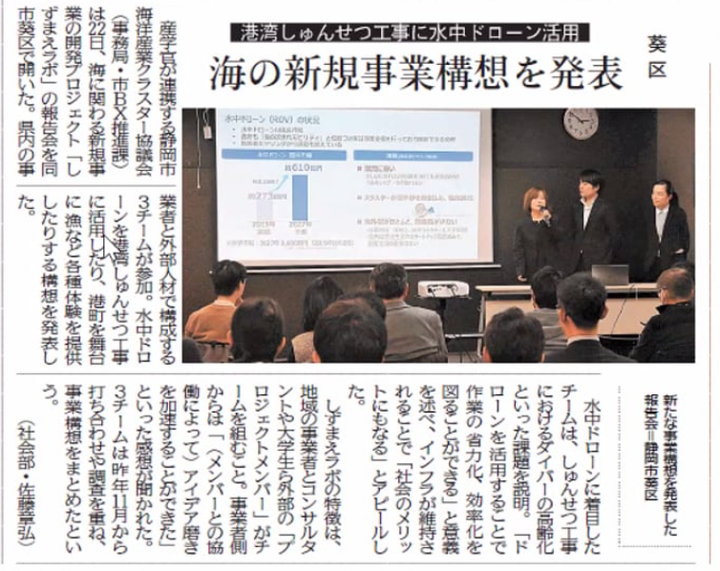 海洋産業クラスター協議会の取組に事業開発者として参加参加しました。 期間中は静岡のジヤトコ株式会社さんと一緒にUAVを活用した事業開発を進めました。