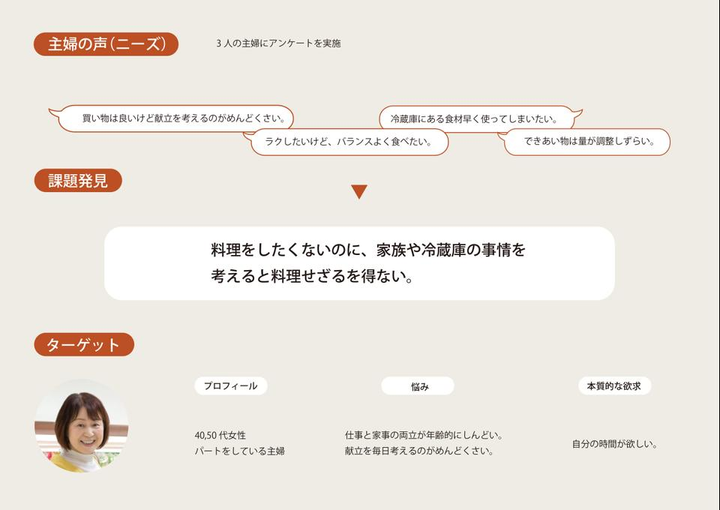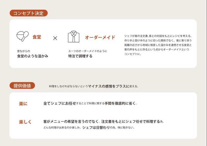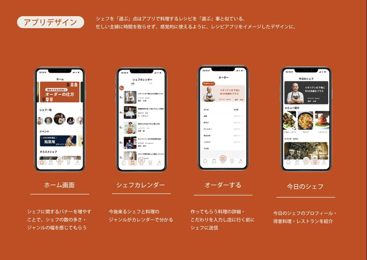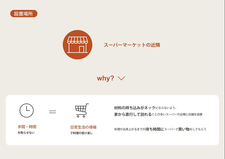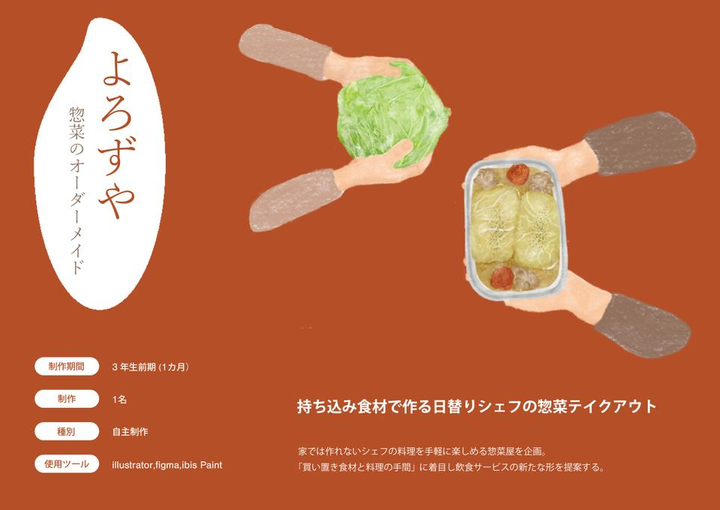 家では作れないシェフの料理を手軽に楽しめる惣菜屋を企画。 「買い置き食材と料理の手間」に着目し飲食サービスの新たな形を提案する。