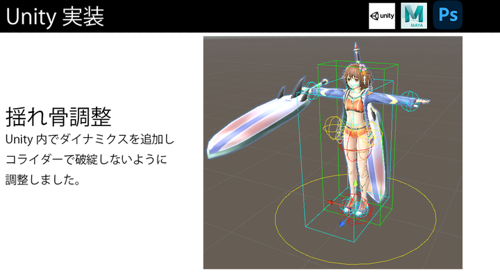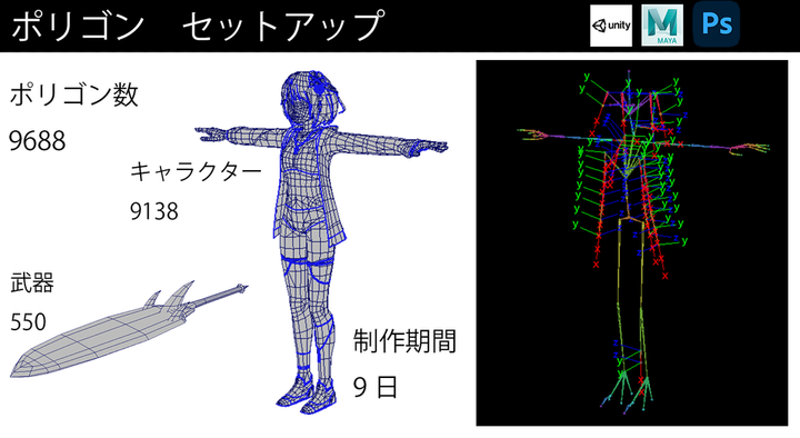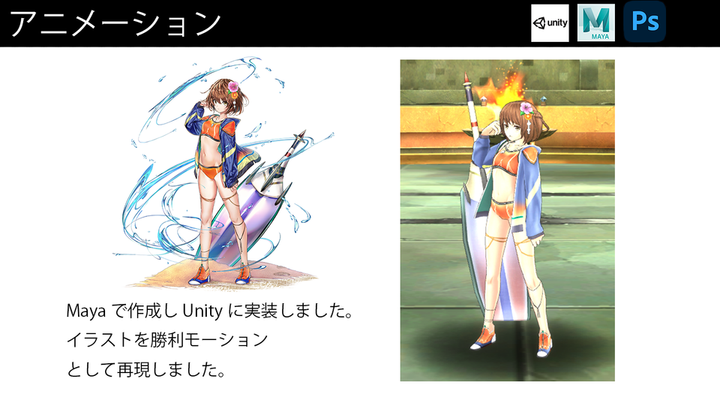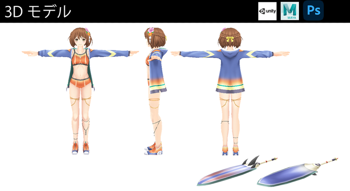 ポートフォリオの一部を公開いたします。 夏のイベント時に追加したキャラクターです。 キャラクターモデリング、テクスチャ、セットアップ(リギング)、unity実装、モーション制作を担当しました。