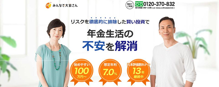 みんなで大家さんは、不動産特定共同事業法に基づき、対象不動産から得られる賃貸利益を分配原資とする不動産投資商品です。 営業者は、不動産取引・管理の専門家として、これまで住居から商業施設など幅広い種類の不動産に関する課題を解決してきた実績を基に、不動産の安定運用を実現しております。 そのため、本シリーズにおいて過去1度も想定利回りを下回ることがなく、運用をすることができております。 比較的安定した資産運用をお求めの方々にご好評を頂いております。