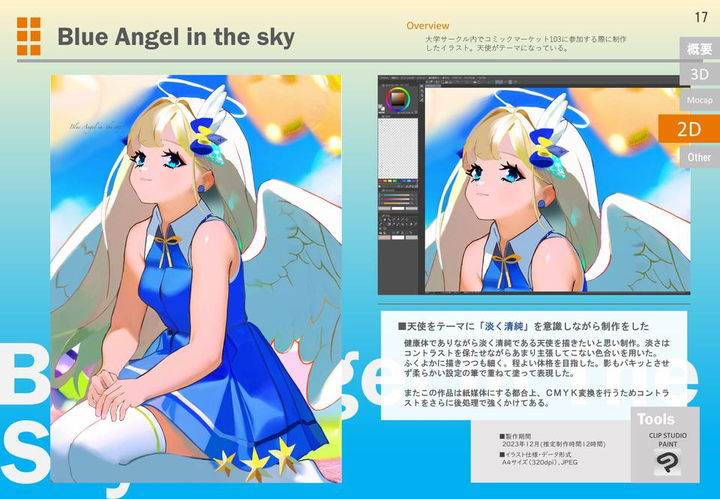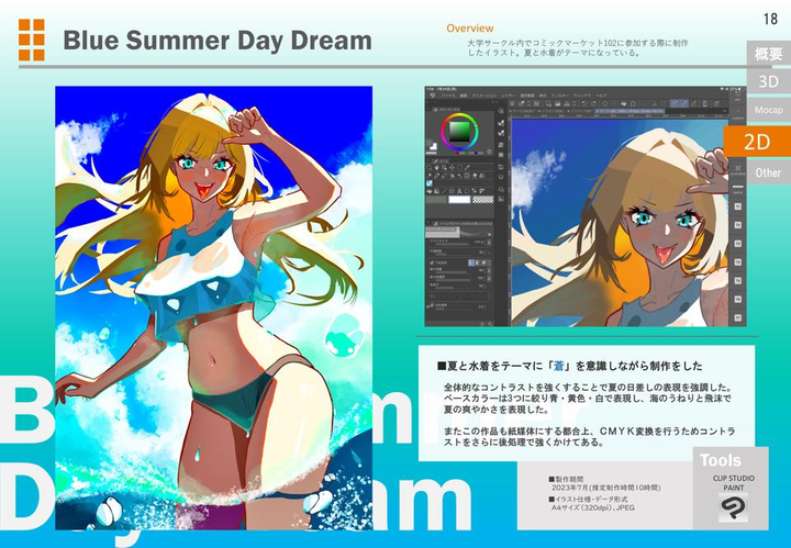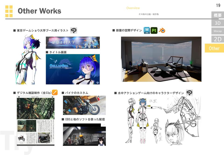 大学では主に3DCGについてデザインやテクニカルな分野を広く学んできています。そのほかにもプログラミングやタイポグラフィー、デジタルテキストデザインやイラスト制作など多岐にわたって学んでいます。その知識を生かしてゲーム制作やイラスト本制作をチームで行い、東京ゲームショウやコミケ等に作品を出した経験があります。
