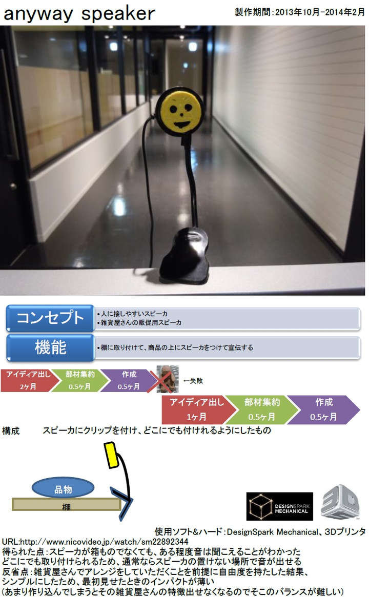•人に接しやすいスピーカ •雑貨屋さんの販促用スピーカ 私の専攻である音響とインタラクティブ性にこだわった作品です