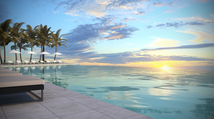 建築グラフィック(The Water Hotel) 南国にあるホテルの屋上プールをイメージして制作しました。 使用したソフトはAutoCad, 3DS Max, V-Ray, Photoshopです。