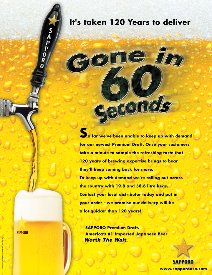 Sapporo Premium Draft Trade/Consumer Ad "Gone in 60 Seconds"
