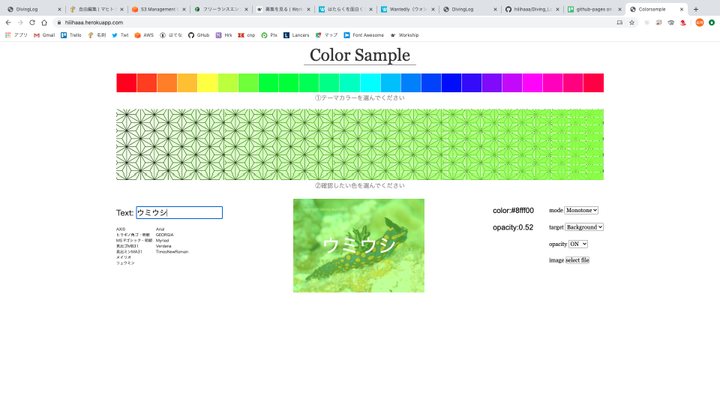 作成途中。 色の確認用。選択した色を16進数の形で出力する。 上部のところでベースとなる色を選択し、下部でもう少し詳細に色を選ぶ。 その他、画像を載せて透け感を出した時の様子も確認できる。