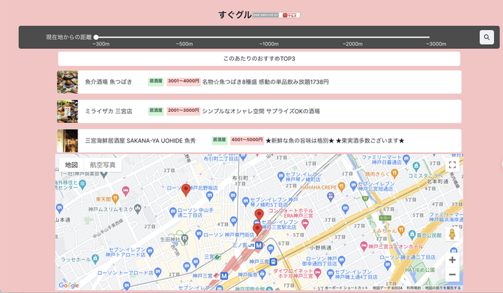 京極 慶高飲食店を検索するアプリの制作現在地からの距離を元に飲食店を検索するアプリ。ホットペッパーグルメのAPIとGeolocationAPIを使用して制作。suguguru.vercel.app でさらに詳しく