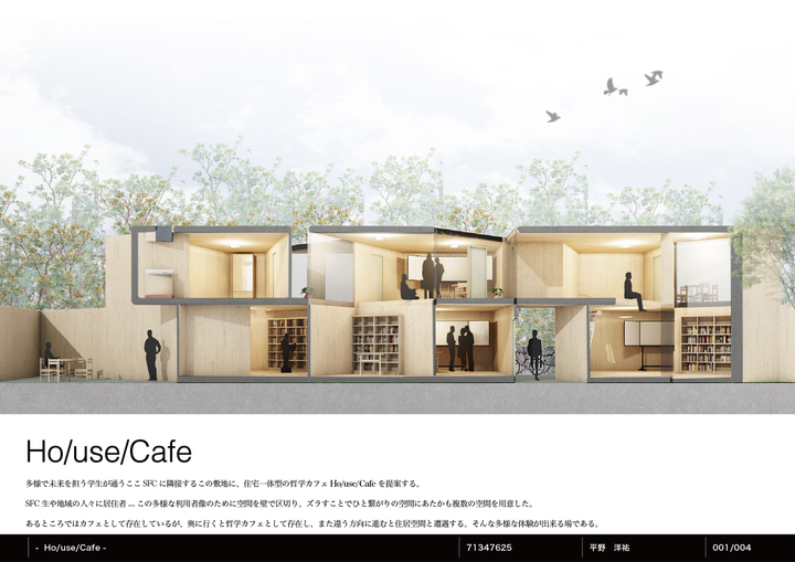 大学の講義にて建築設計課題の最終成果物。Illustrator,Photoshop,Archicadを使用してパースやダイアグラムを作成。