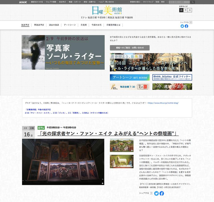 NHK Eテレの美術番組「日曜美術館」をアシストするウェブコンテンツの作成・管理。「出かけよう、日美旅」「アートコラム 〜もっと楽しむ 〜」等(放送毎に作成)。
