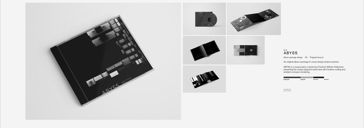 Album Package Design 3D Programming Art An original album package & visual design project practice ABYSS is a visual project, inspired by Friedrich Wilhelm Nietzsche, presenting the unique abgrund world view with Creative coding and ambient occlusion rendering.