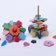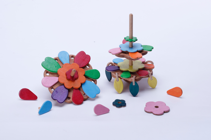 5〜6歳の女の子をターゲットに作製したこまです。男の子の遊びというイメージの強いこまを女の子にも楽しんでもらいたいという思いを込めて作りました。土台に様々な色や形の花びらを挿したりかけたりして回した時の変化を楽しむこまになっています。