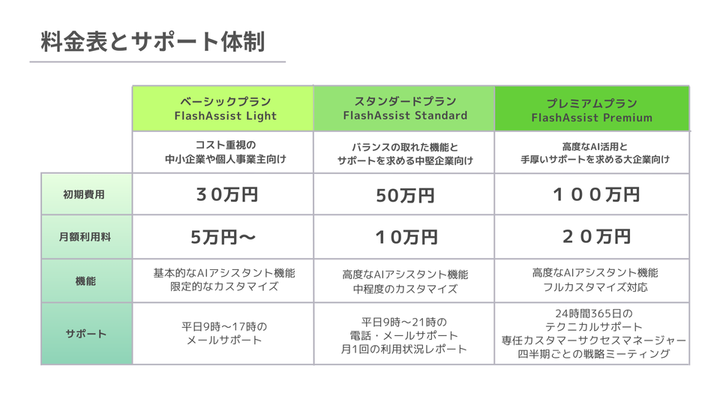 AI導入企業向け 営業資料デザイン スライドを制作しました。 ■ターゲット 中小企業〜大企業までの役職者、決裁者 ■目的 AIを導入したい会社に自社製品をわかりやすく説明できる 営業資料が欲しい ■ポイント 明るめのグリーンを使い、 スタイリッシュなデザインにしました。 イメージ写真や余白を意識しました。 表や文字のあしらいを使用し、ひと目でわかりやすくしました。