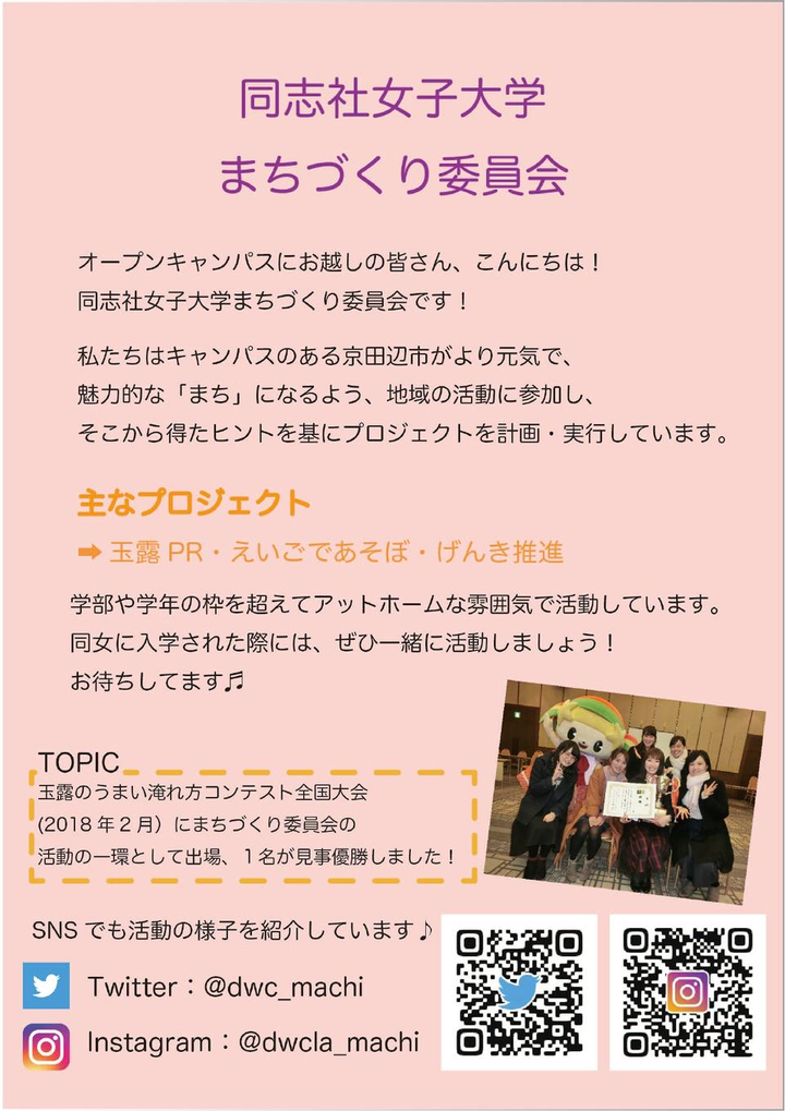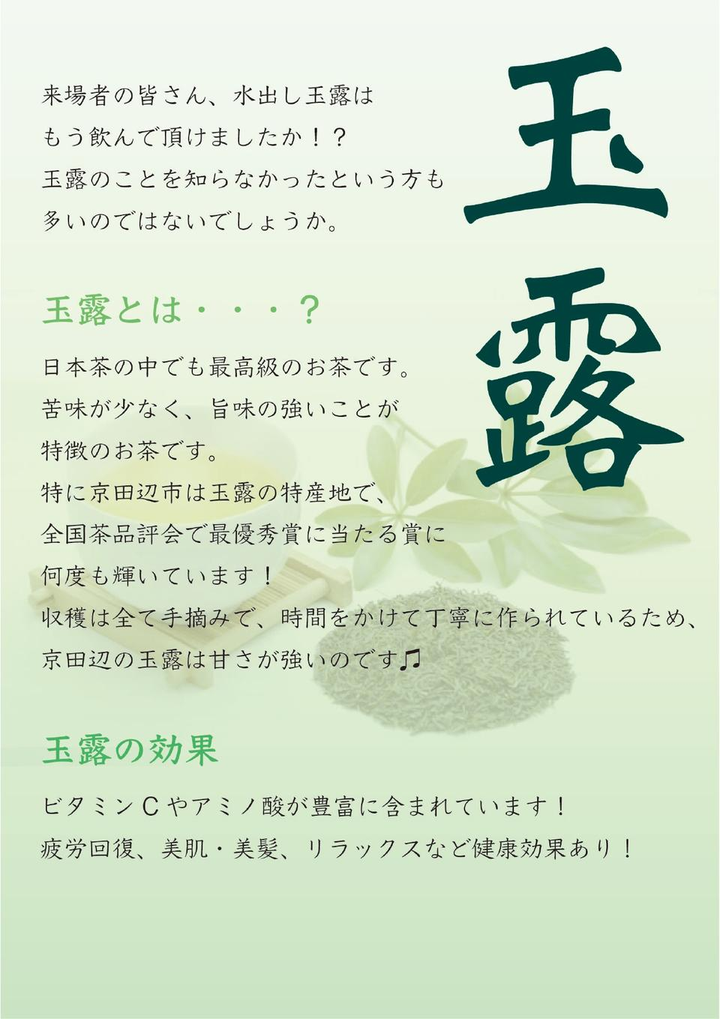 キャンパスがある京田辺市の魅力の発信や地域交流を行う委員会で玉露の魅力を伝えるプロジェクトに参加。玉露の試飲会やそれに伴うチラシ作成に携わった。