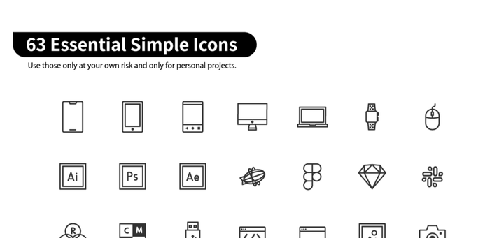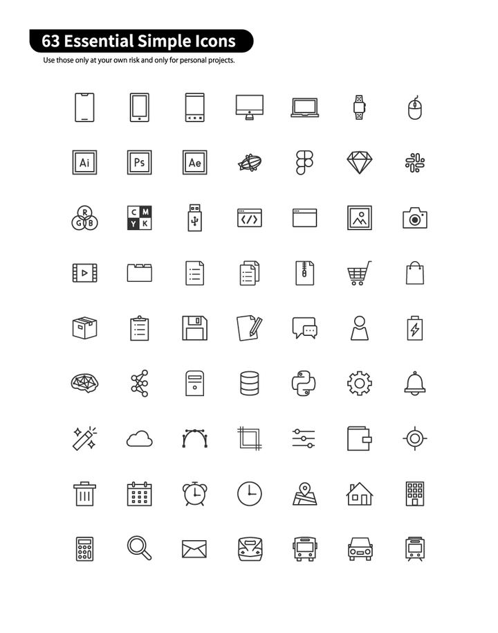 63のフリーアイコン集を作成しました。自身がUIデザインを行う際に使用頻度が高いものを中心に、カスタムしやすいようになるべくベクターのラインだけで作成するよう工夫しました。他のフリーアイコン集にはないアイコン(スマートウォッチ、デザインツール、新幹線)があるのが特徴です。