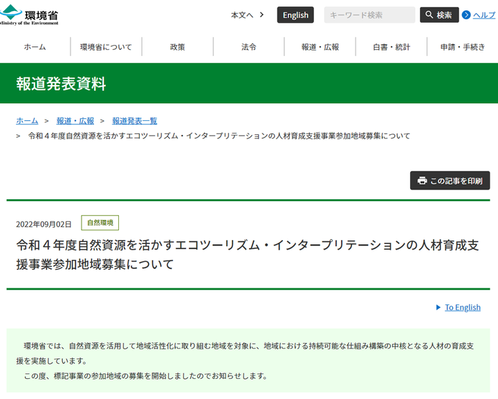 環境省 人材育成事業 検討委員(国立公園満喫プロジェクトエコツーリズム人材育成事業)