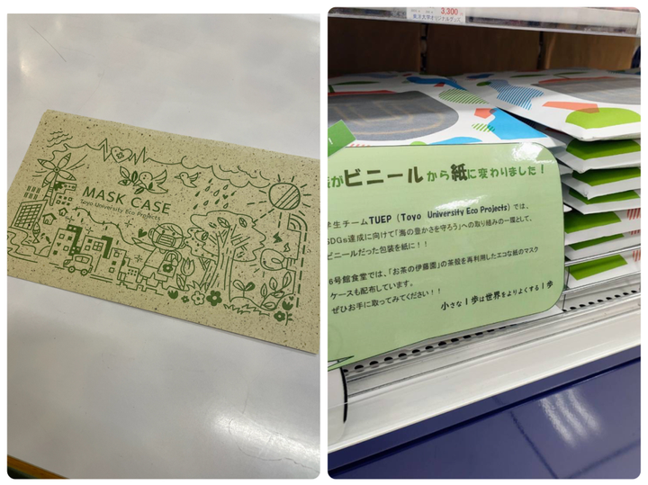昨年設立された学生団体「TUEP(Toyo University Eco Projects)」で脱プラを目的とした製品紙のマスクケース(左)と外装紙(右)の開発を行いました!実際に東洋大学の学食と生協に設置されています。 様々なコミュニティの方と関わり、いろんなアイディア、意見と向き合う活動は楽しく、完成した日は大きな達成感を味わうことができました。